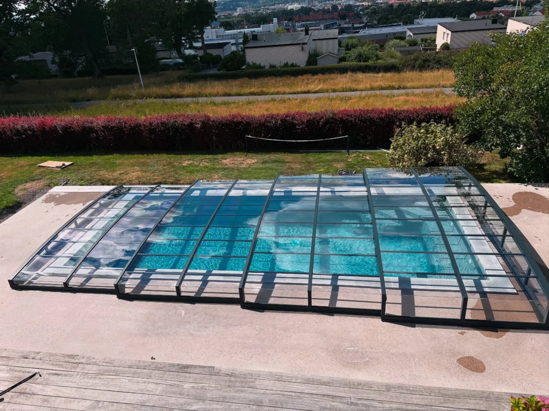 Den smidiga, ihopfällbara konstruktionen gör att du enkelt skjuter undan taket och öppnar upp hela poolen. Med förlängda skenor kan det parkeras diskret bakom poolen – helt ur synfältet.