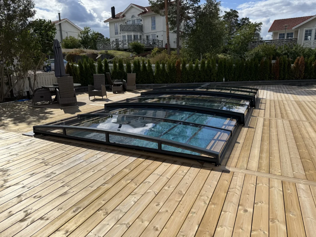 Den låga, eleganta profilen bevarar utsikten och förstärker känslan av rymd. Resultatet är ett pooltak som knappt syns – men som gör all skillnad.
